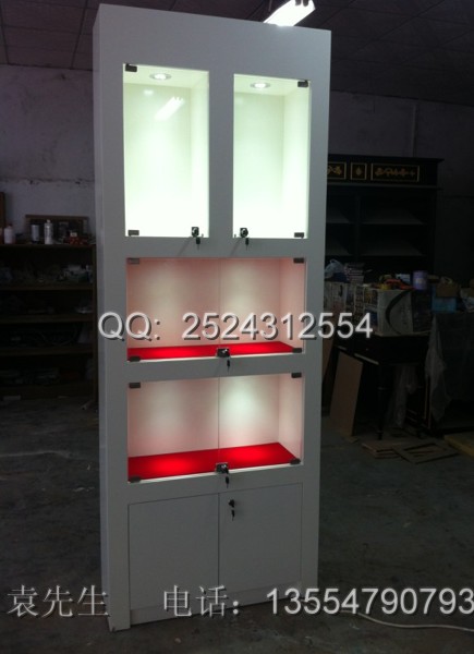 珍珠展示柜采用中纖板做白色亮光烤漆,LED冷光源燈具,LOGO為絲印。柜體里面包紅色絨布。玻璃正開門玫瑰金包邊。