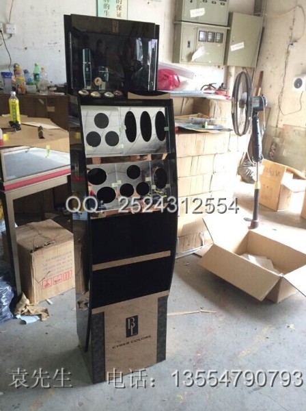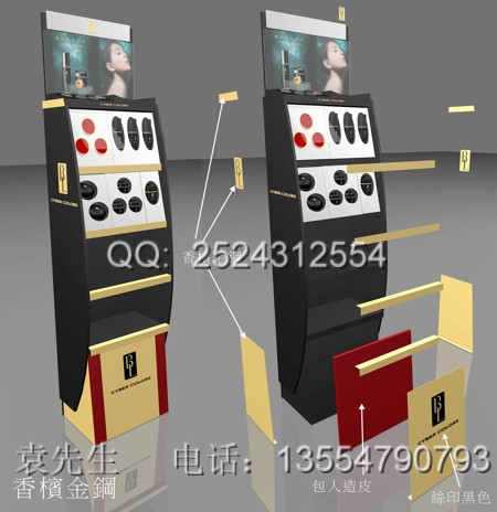 香港化妝品展臺尺寸;390*245*1450mm,柜體中纖板黑色亮光烤漆,香檳金顏色不銹鋼,黑色絲印LOGO。