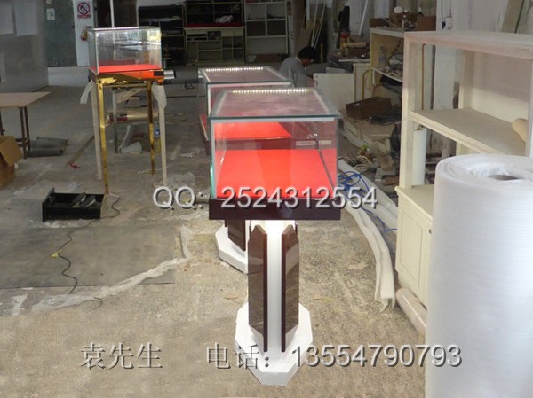 深圳工商銀行精品展柜分為二款;一款是常規的條柜,尺寸;1000*500*900mm,柜臺采用中纖板做基層,表面白色和咖啡色亮光烤漆,玻璃為超白玻璃,臺面包紅色皮革。柜臺外面四周也一圈LED燈具,亞克力水晶字,玻璃抽拉門。