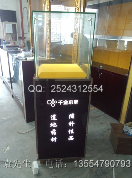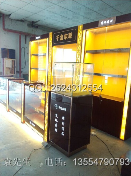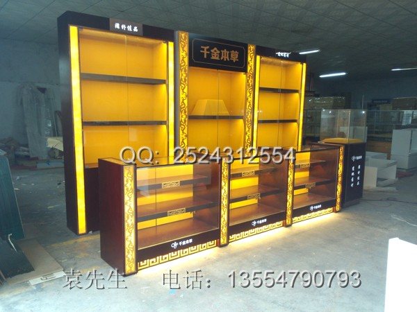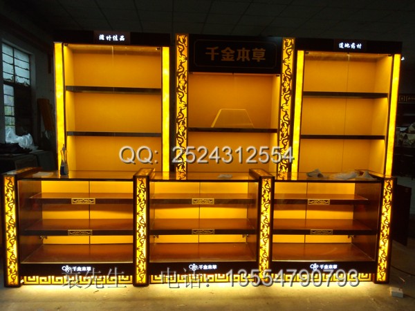 千金本草參茸展柜采用大芯板做基層,表面櫻桃木飾面,做紅色油漆。