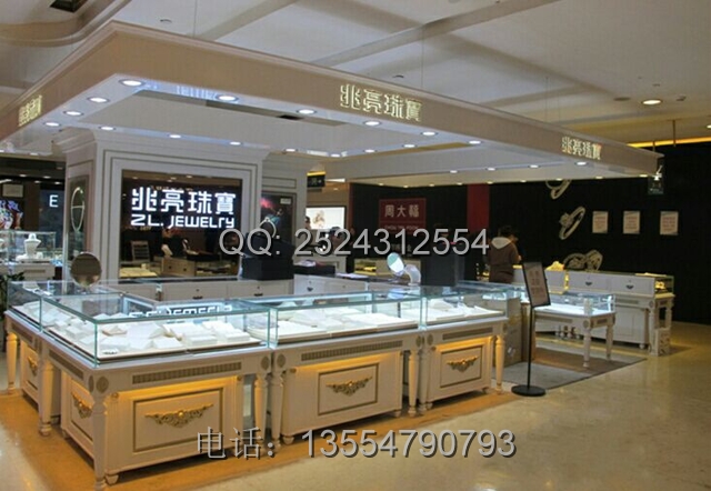 如下圖為歐式風格的兆亮珠寶展示柜布局圖,位于深圳寶安區,白色是其主要風格,展柜配歐式羅馬柱,古銅式拉手。華信展柜(m.flaredup.com.cn)公司專業設計制作符合商場規劃的展柜。