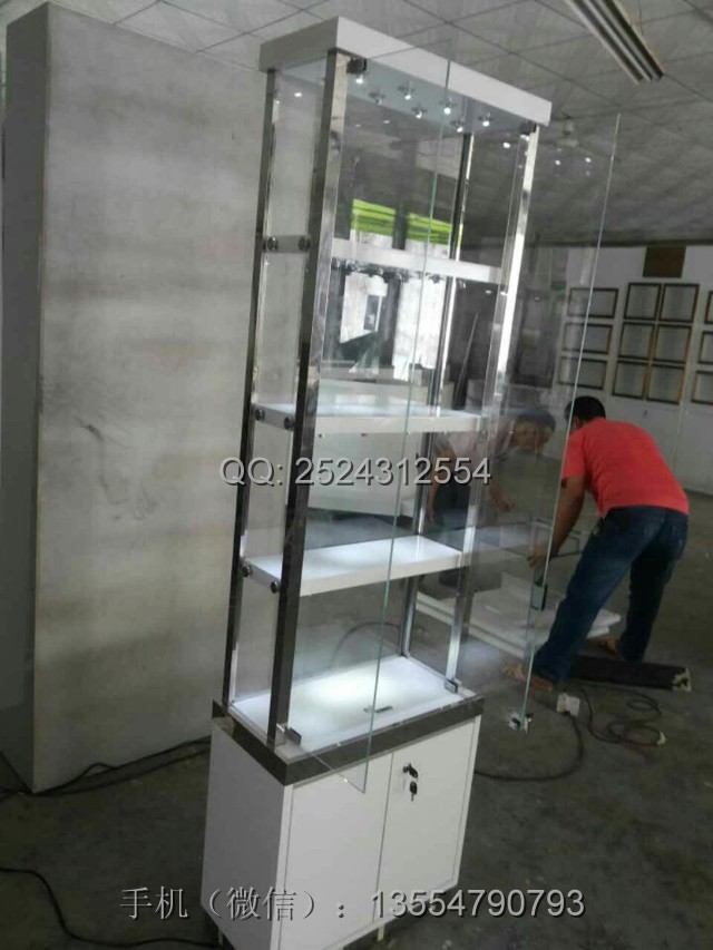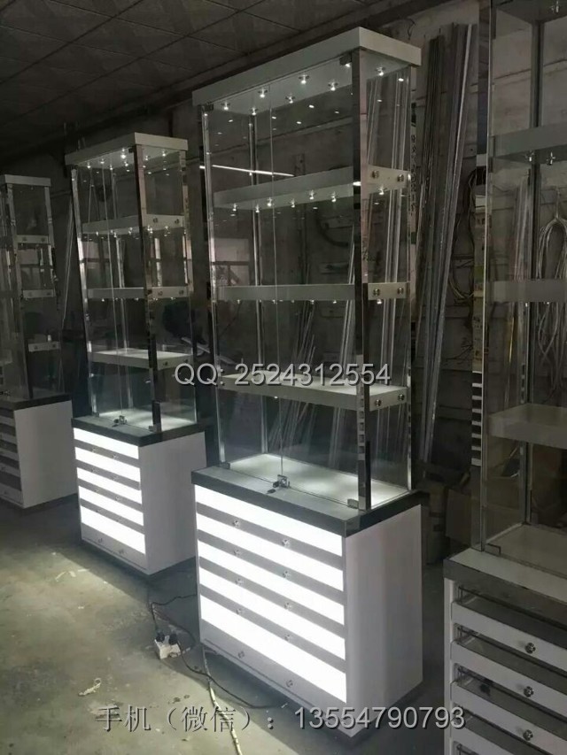 飾品展柜尺寸:600*300*2200mm,密度板白色亮光烤漆,玻璃都為8厘超白鋼化玻璃,鏡面不銹鋼包邊,每層層板下面8個(gè)正白光牛眼射燈。