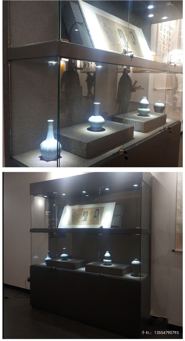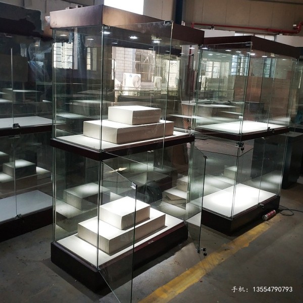 由于客戶放的都是現代工藝品,客戶優先考慮的是博物館展柜的價格,所以選擇要求不高的木質博物館展柜,所用材料都是普通的材質,普通10mm鋼化玻璃,中纖板咖啡色烤漆,柜內3w射燈,包亞麻布的梯形展臺。
