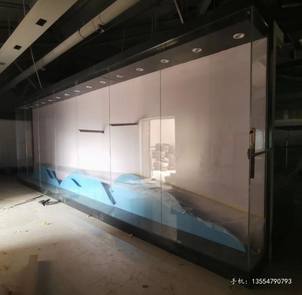 材質:冷軋鋼板黑色金屬氟碳烤漆,10超白鋼化玻璃,LED燈,專用麻布展臺。
