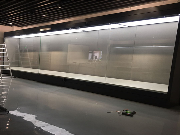 衡東美術館沿墻通柜采用矩形方管焊接成型,使用本司特制U型槽,靜音順滑導軌,特制合金鋁材包邊,表面1.5mm冷軋鋼板高溫無塵靜電噴涂處理。 玻璃為6+0.76+6超白夾膠玻璃,開啟方式為電動遙控平移開啟。深圳華信展柜廠定制各類博物館需要的展柜,提供定做和安裝整個服務,歡迎前來咨詢。