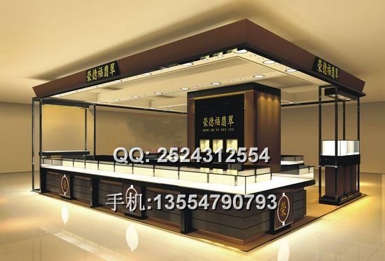 榮德祥翡翠展示柜設計效果圖由華信展柜廠設計師設計,該店面所有柜臺采用中纖板做基層,表面貼胡桃木飾面板,在做油漆,玻璃采用8里鋼化超白玻璃,玻璃通透性比較好。