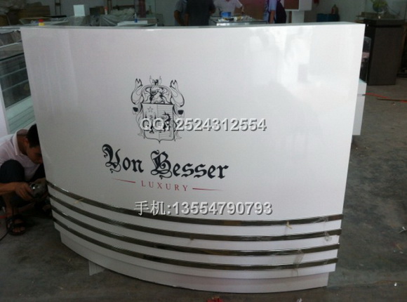 2、油漆:采用進(jìn)口木器專用漆,在恒溫、恒濕高度防塵的面漆房噴涂面漆。無顆粒、氣泡、渣點(diǎn),顏色均勻;收銀臺表面平坦光滑,無劃傷、開裂和變形。