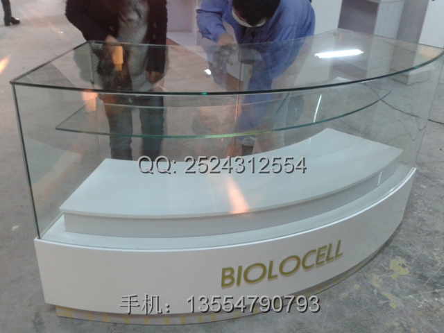 弧形化妝品展示柜高密度板做基層,表面白色亮光油漆處理,此款化妝品展柜是出口到澳大利亞的,柜臺尺寸:1800*500*1000mm,展柜包裝為木箱包裝,由于柜臺為弧形的,玻璃需要開模熱彎,造價也會偏高點。