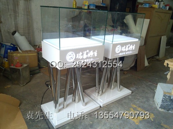 瑞養源生保健品展示柜由華信展柜公司訂做,展柜尺寸:500*400*1200mm,柜體結構為密度板,展柜表面白色亮光烤漆,白色亞克力字鏤空透光。中間的為鏡面不銹鋼鋼管交叉支撐。